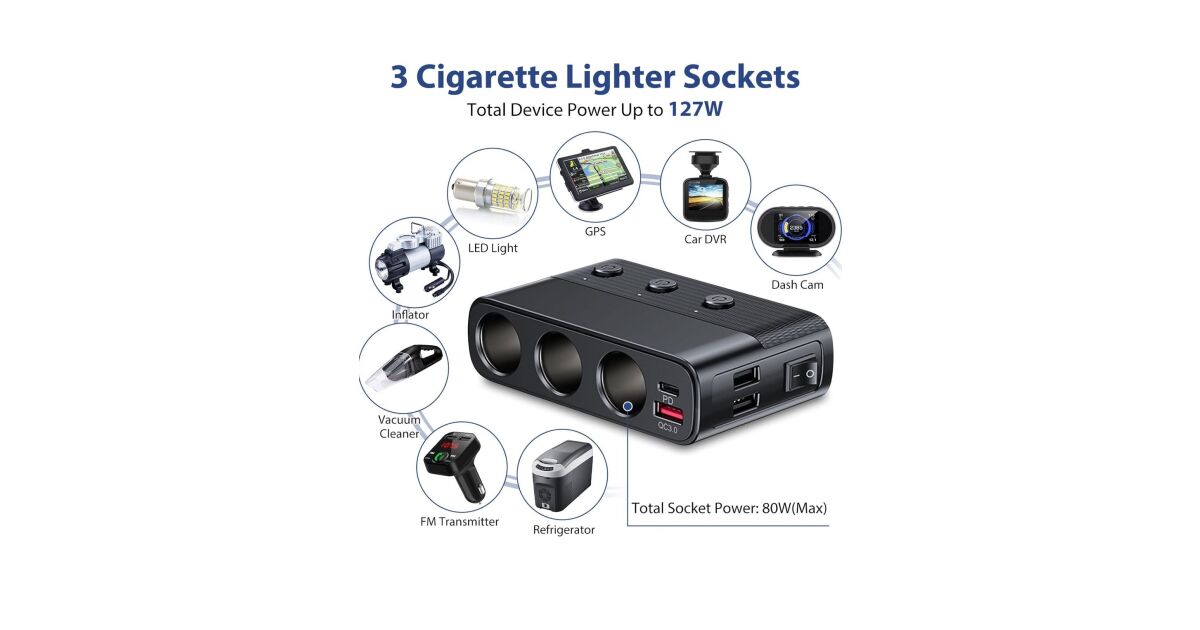 Този многофункционален адаптер за автомобил е идеалното решение, ако искате да зареждате или захранвате няколко устройства едновременно в колата си. Три контакта за запалка, три USB порта и един USB-C порт гарантират, че има място за всички ваши устройства. Вграденият цифров волтметър непрекъснато следи напрежението на акумулатора, така че можете да избегнете презареждане или недостатъчно зареждане.