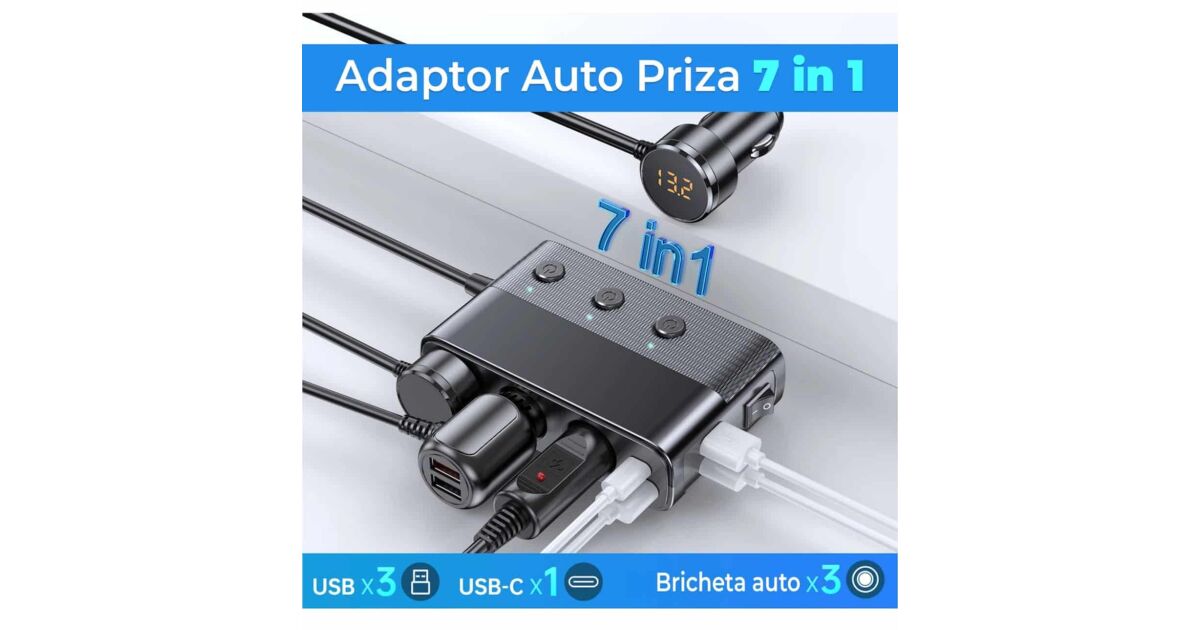7-в-1 адаптер за автомобилен контакт със LED дисплей, 3 x USB Q.C 3.0 и USB-C порт 127 W с вграден волтметър, AutoREY®️, 3 контакта за автомобилна запалка