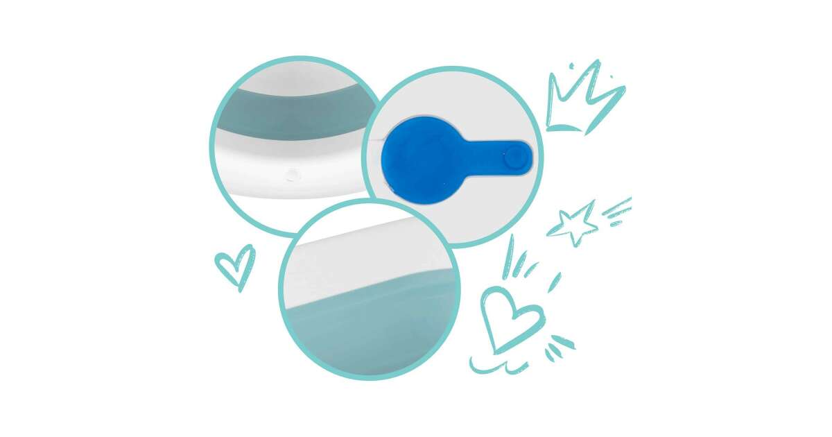 - Сменяща цвета си тапа: При температура над 38°C цветът на тапата се променя от син на бял, което веднага показва, ако водата е твърде гореща.