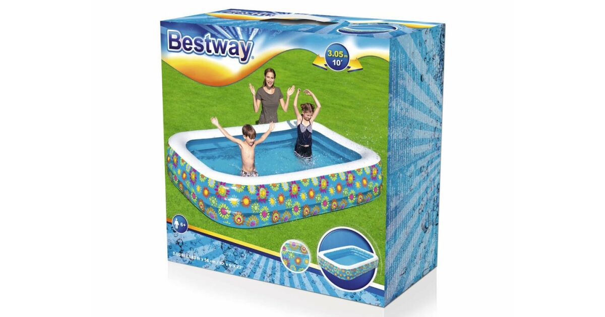 Този надуваем басейн Bestway е идеален избор за горещите летни дни. С размери 305 x 183 x 56 cm, той е достатъчно голям, за да побере цялото семейство, а веселият дизайн с цветя ще освежи атмосферата в градината. Благодарение на издръжливия винилов материал, той е устойчив на механични повреди и UV лъчи.