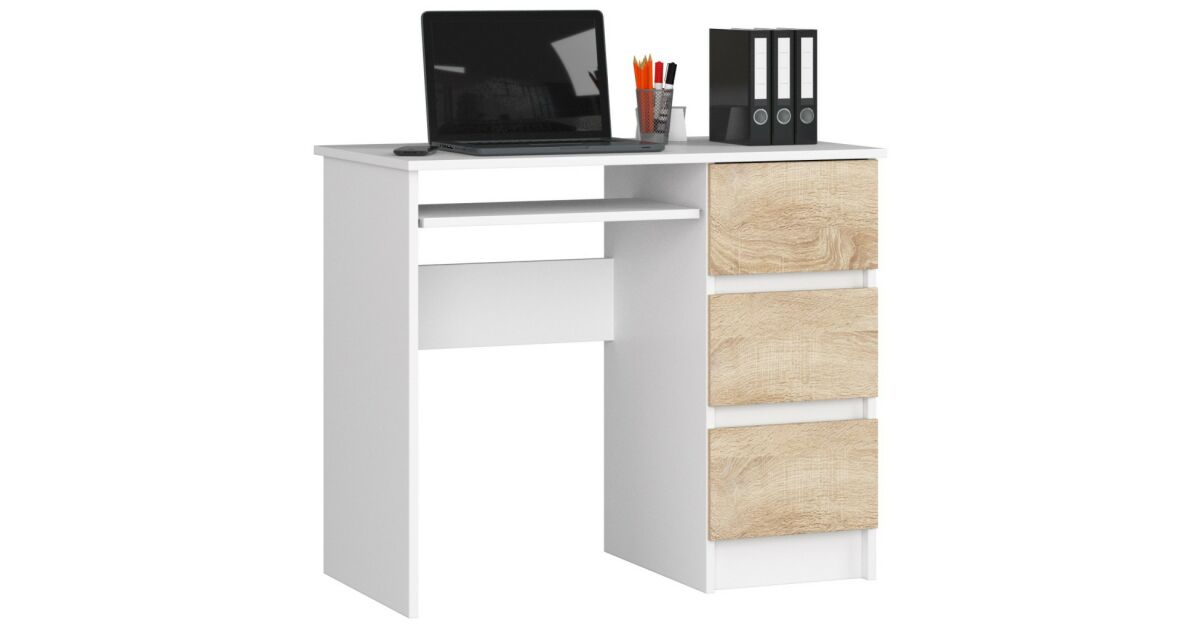 Компютърно бюро с 3 чекмеджета и рафт за клавиатура, дясно, 90x50x77 см, бяло и дъб сонома