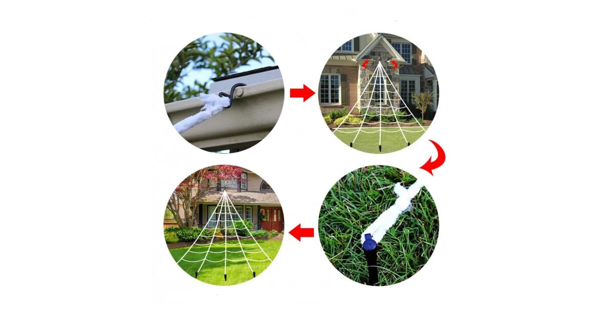 - Голяма паяжина (7 x 5,5 m): Изработена от пухкав, еластичен и устойчив памук, идеален за поставяне на порти, дървета или стени.