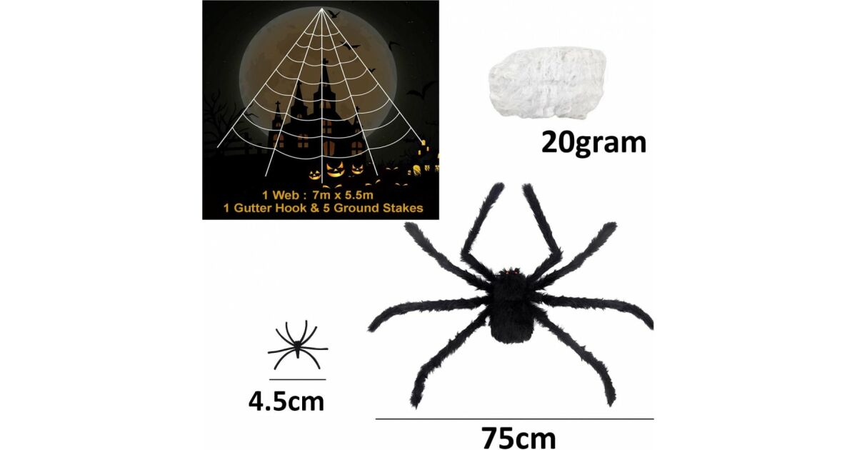 - 6 пластмасови паяка: Предлагат се два размера (75 cm и 4,5 cm) за максимален визуален ефект.