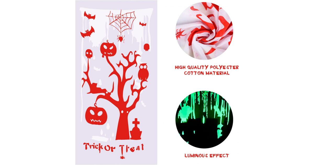 Създайте страховита атмосфера на вашето Хелоуин парти с тази светеща завеса с размери 79 x 155 cm! Тя свети зловещо в тъмното, гарантирайки, че празненството ще бъде запомнящо се. Изработена е от висококачествен памучен плат, издръжлива и лесна за почистване.