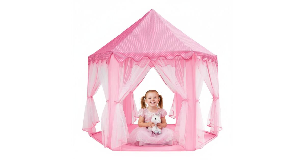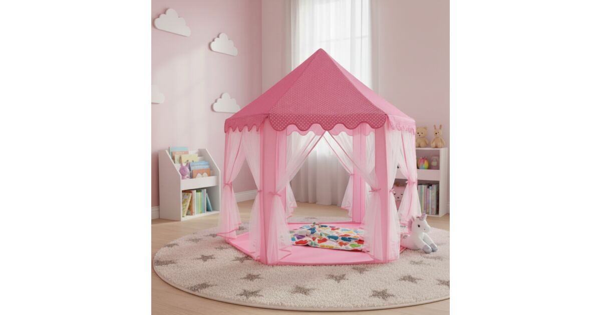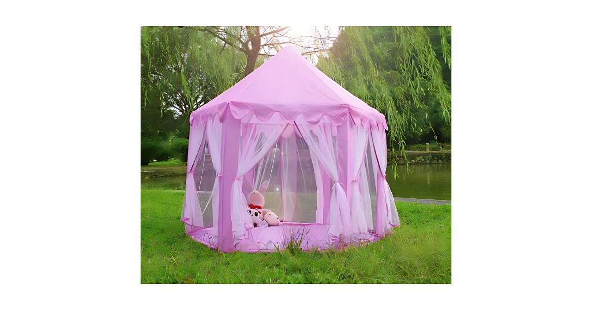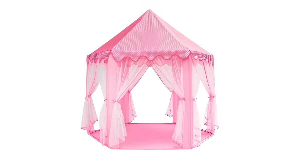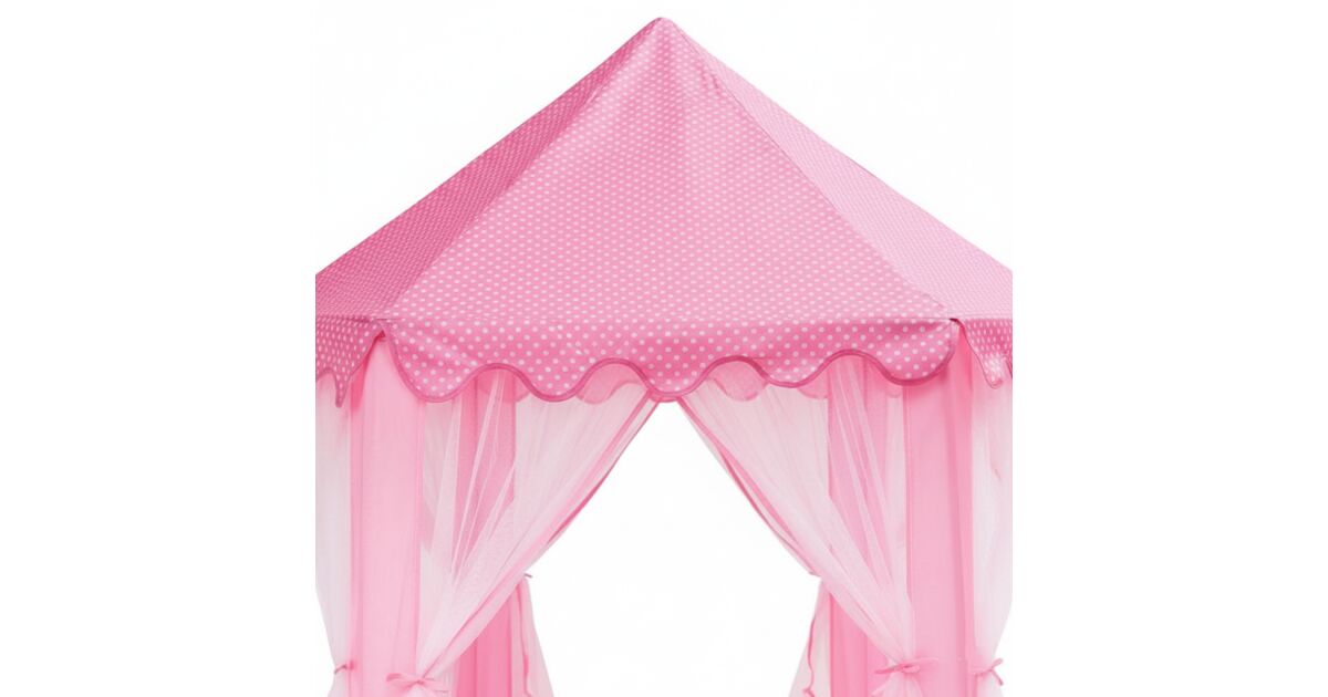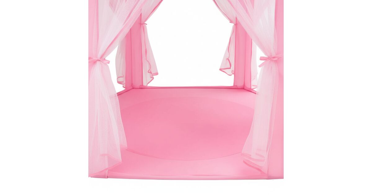 Тази красива розова игрална палатка е идеалното място за креативни игри на децата, както вкъщи, така и в градината. Стимулира въображението и осигурява часове забавление, както сами, така и с приятели. Шестоъгълната основа и пирамидалният покрив на палатката разполагат с 6 входа. Клиентите отбелязват, че палатката е по-голяма, отколкото са очаквали, и че побират се повече деца.