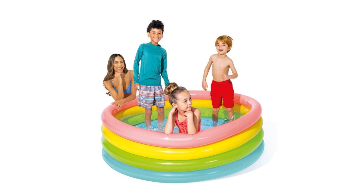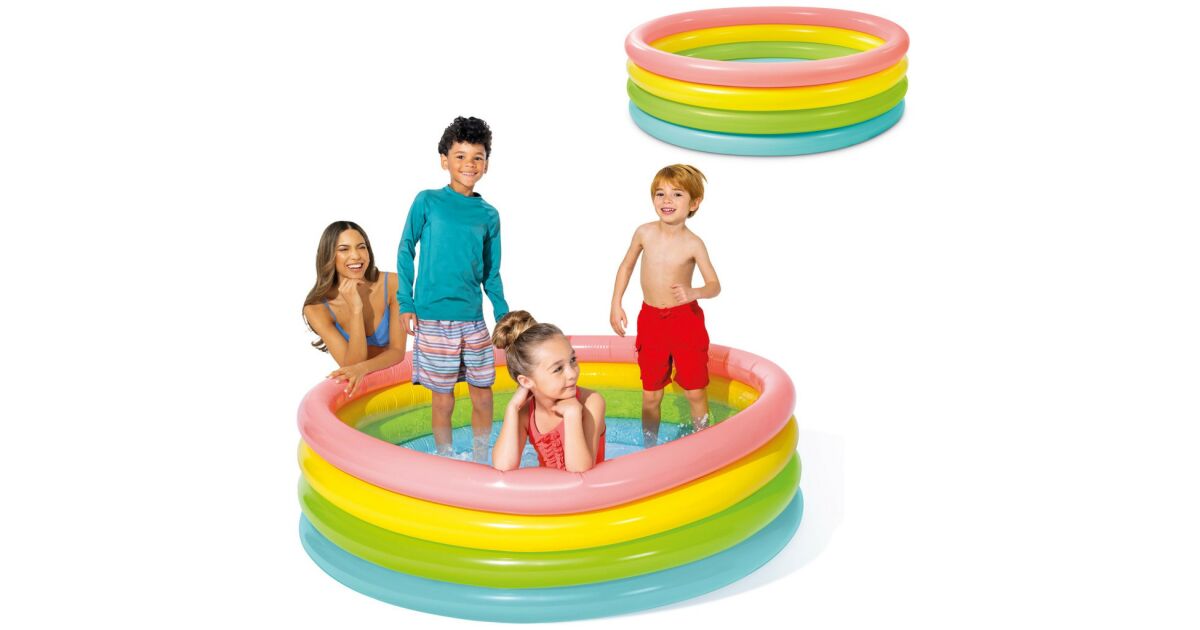 Този весел, дъговиден надуваем басейн Intex е перфектен за горещите летни дни! С удобното си, меко надуваемо дъно и ярки цветове, гарантира часове забавление за малчуганите. 💦