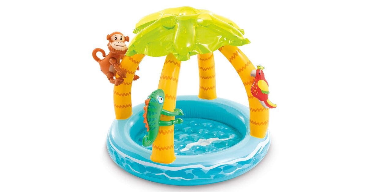 Този прекрасен, надуваем басейн Intex с формата на тропически остров гарантира безгрижно лято за най-малките! Палмовото дърво създава сянка в горещите дни, така че децата могат да се пръскат безопасно и удобно. Забавните животински фигурки пък добавят още забавление.