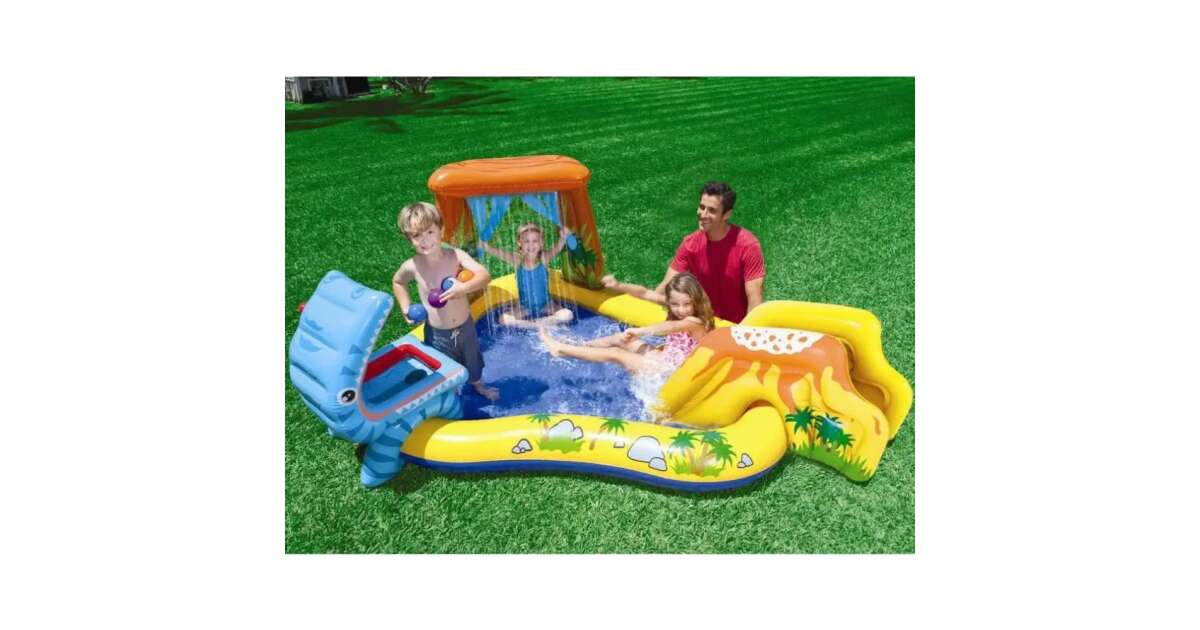 Този голям надуваем басейн с динозавърска тематика гарантира незабравимо лятно преживяване за вашето дете! Няколко деца могат да се радват на водни игри едновременно и безопасно. Забавен динозавър, пързалка, палма с поливалка и водопад осигуряват допълнително забавление. Водният поток лесно се регулира с контролен клапан.