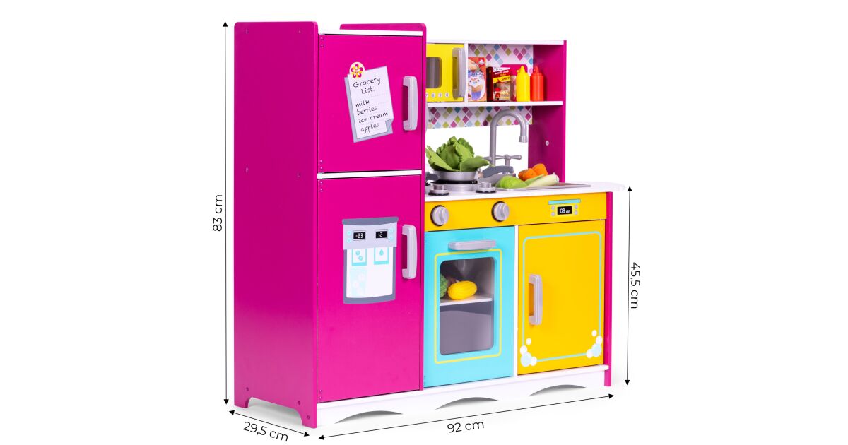 -Голяма дървена кухня за игра за деца с цветни, отварящи се хладилник, фурна, микровълнова печка, играчки ecotoys описание на...
