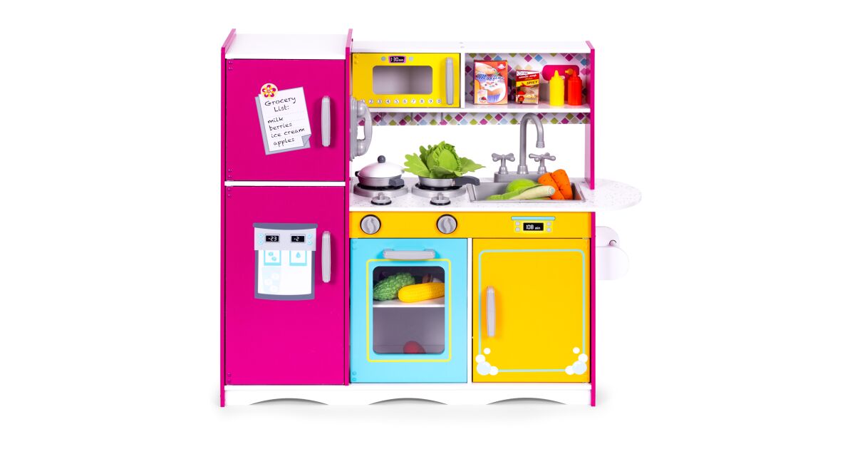 Голяма дървена кухня за игра за деца с цветни, отварящи се хладилник, фурна, микровълнова печка, играчки ecotoys