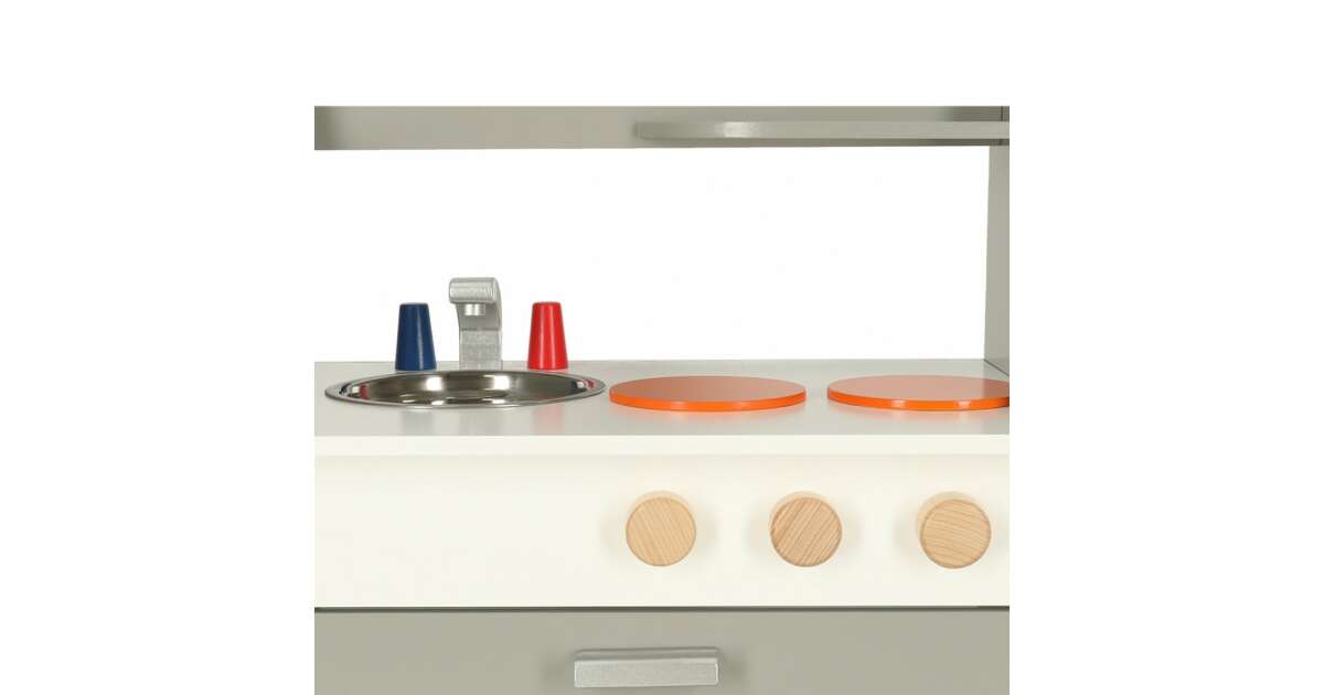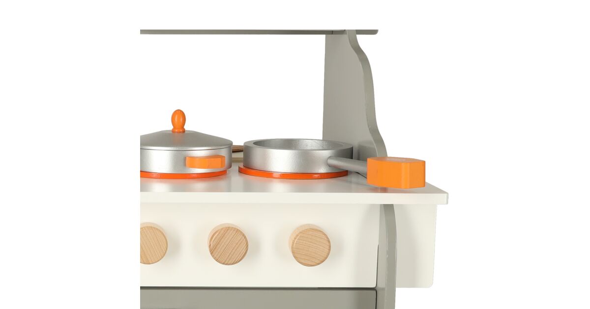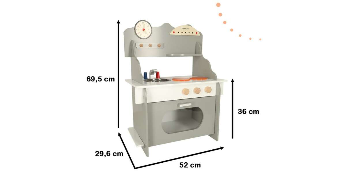 Тази красива, сива дървена кухня е мечтата на всеки малък готвач! Идва с много аксесоари, за да направи играта още по-реалистична. Децата могат да се забавляват с часове, готвейки и печейки, докато развиват въображението и фините си двигателни умения.