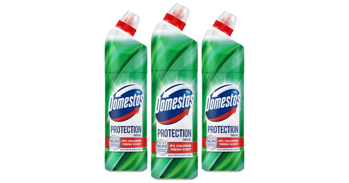 Оставете Domestos Protection безхлорен тоалетен препарат да се погрижи за чистотата и свежестта на вашата баня! С аромата си на евкалипт и дива мента ще ви осигури приятно преживяване, едновременно с това ефективно премахвайки замърсяванията и бактериите.