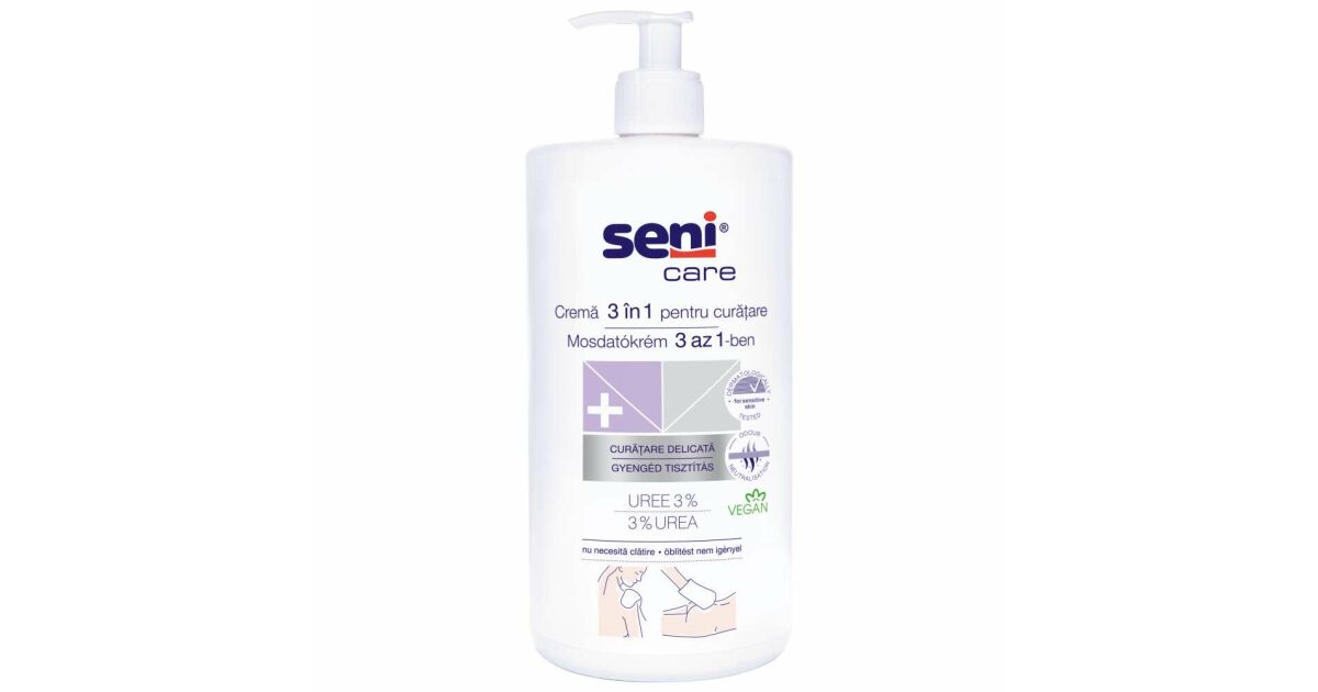 Измиващият крем Seni Care осигурява бързо решение за почистване на повърхността на кожата, замърсена с урина/фекалии, при всяка смяна на пелените. Измиващата кърпа Seni Care може да се използва вместо вода и сапун. Тя има тройно действие: нежно почиства, подхранва и защитава кожата. Осигурява освежаващо усещане, без да засяга естествената хидролипидна бариера на кожата, като ефективно намалява стягането. С практичен дозатор с помпа за ежедневна употреба.