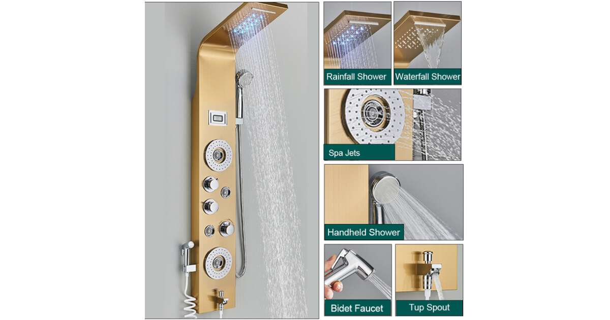 - Елегантен златист дизайн: Украсете банята си с този стилен душ панел. ✨