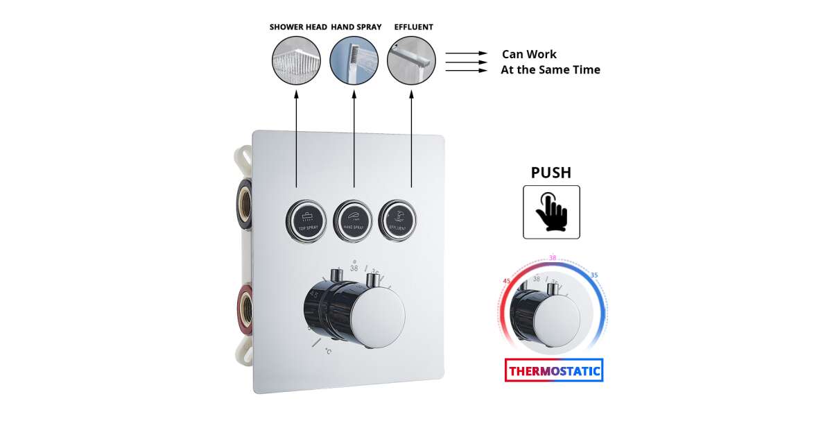 - 3-пътен система: Таванният душ, ръчният душ и смесителят за вана могат да се използват едновременно или поотделно. 💦
