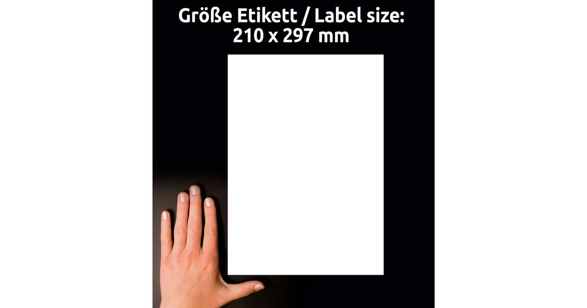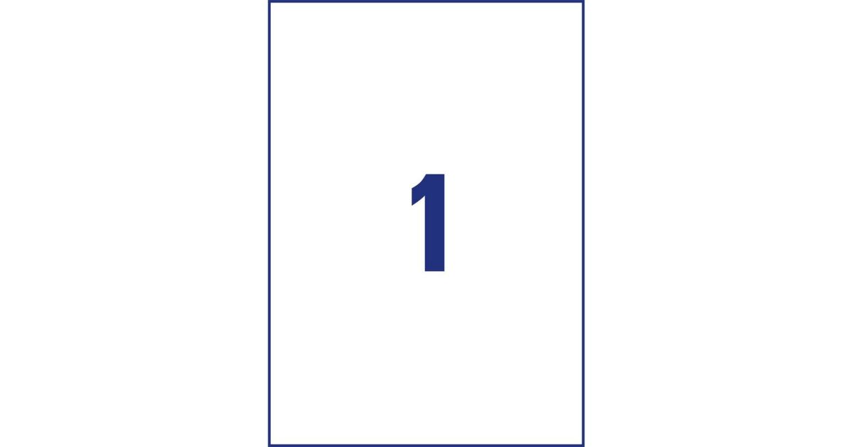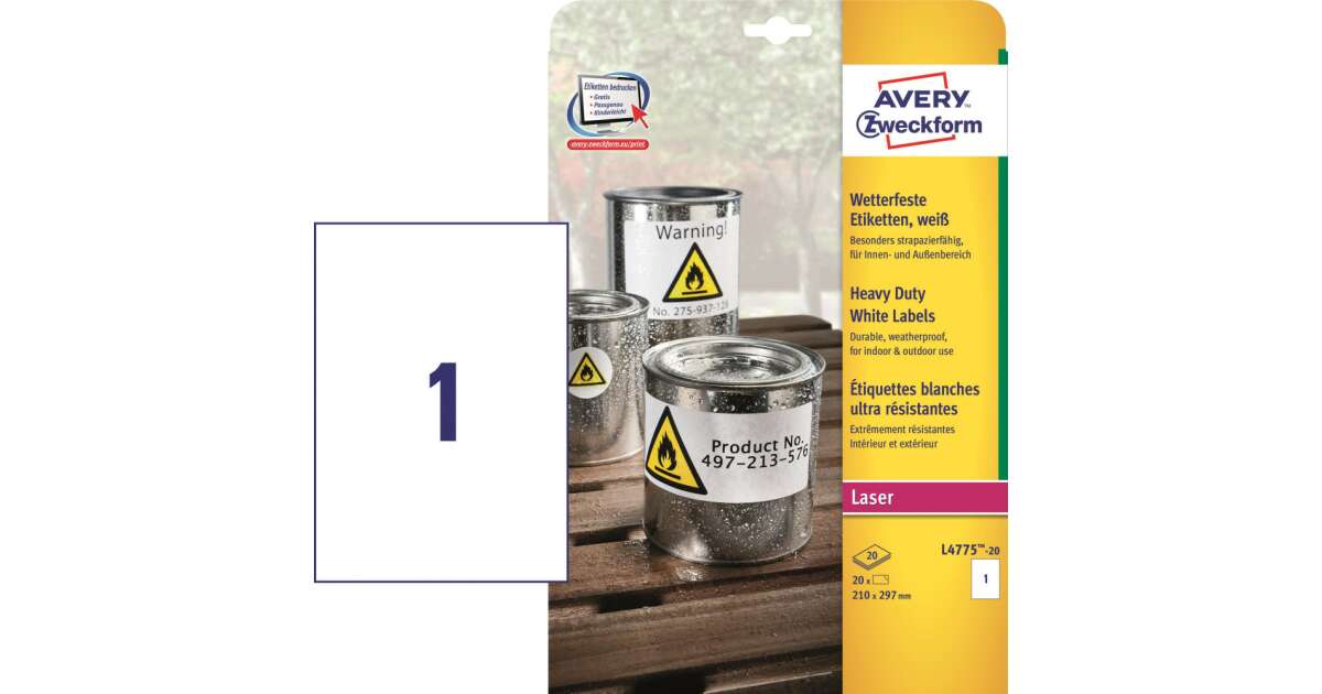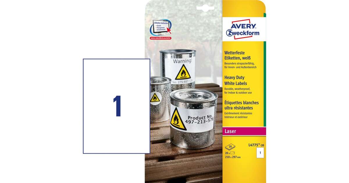 Етикетни стикери, 210 x 297 мм, устойчив на атмосферни влияния полиестер, 1 етикет/лист, 20 листа/кутия, Avery бял