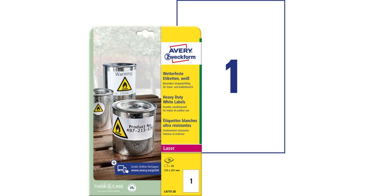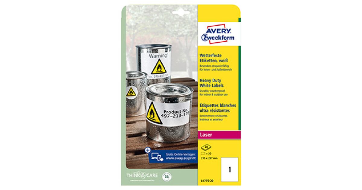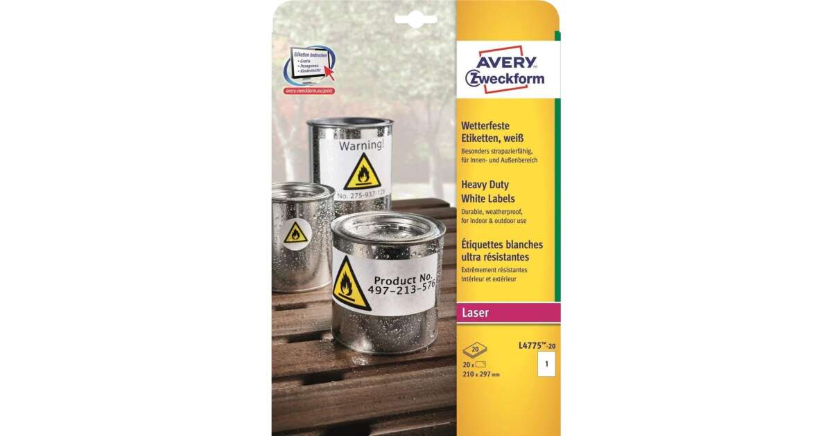 Устойчиви на атмосферни влияния етикети Avery за лазерни принтери: 20 броя бели полиестерни етикети с размер A/4