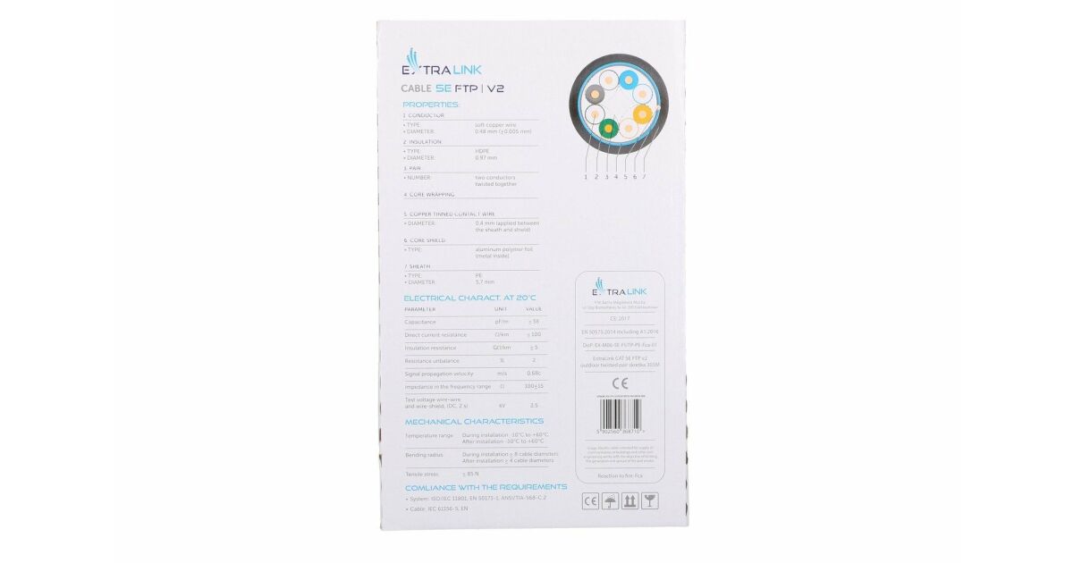 Този здрав 305-метров Extralink CAT5e FTP външен мрежов кабел е идеалното решение за изграждане на мрежови връзки на дълги разстояния на открито. Кабелът, изработен от висококачествени материали, е устойчив на атмосферни влияния, осигурявайки стабилен и надежден пренос на данни.