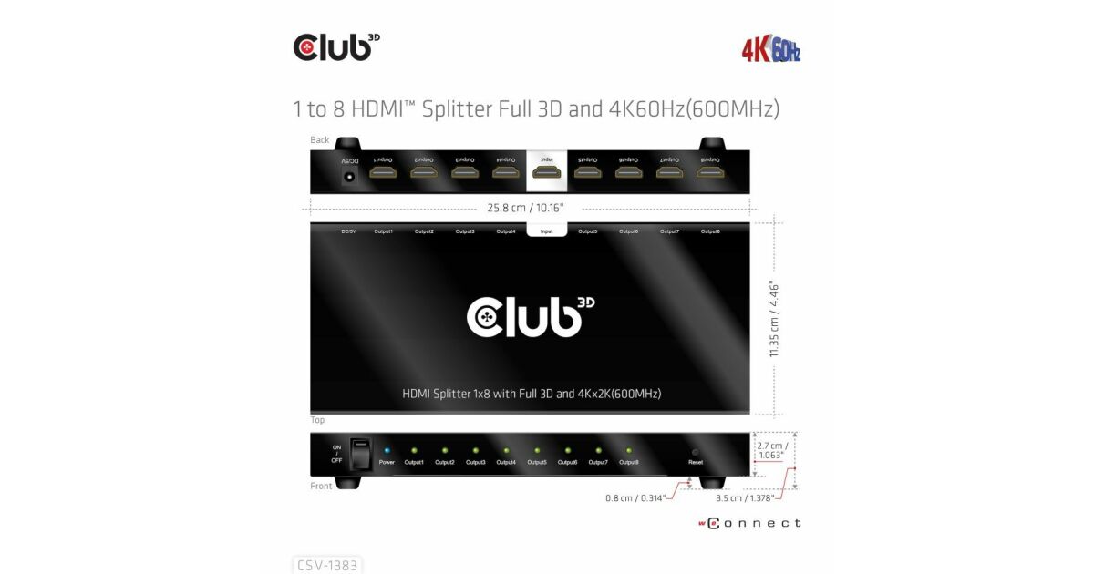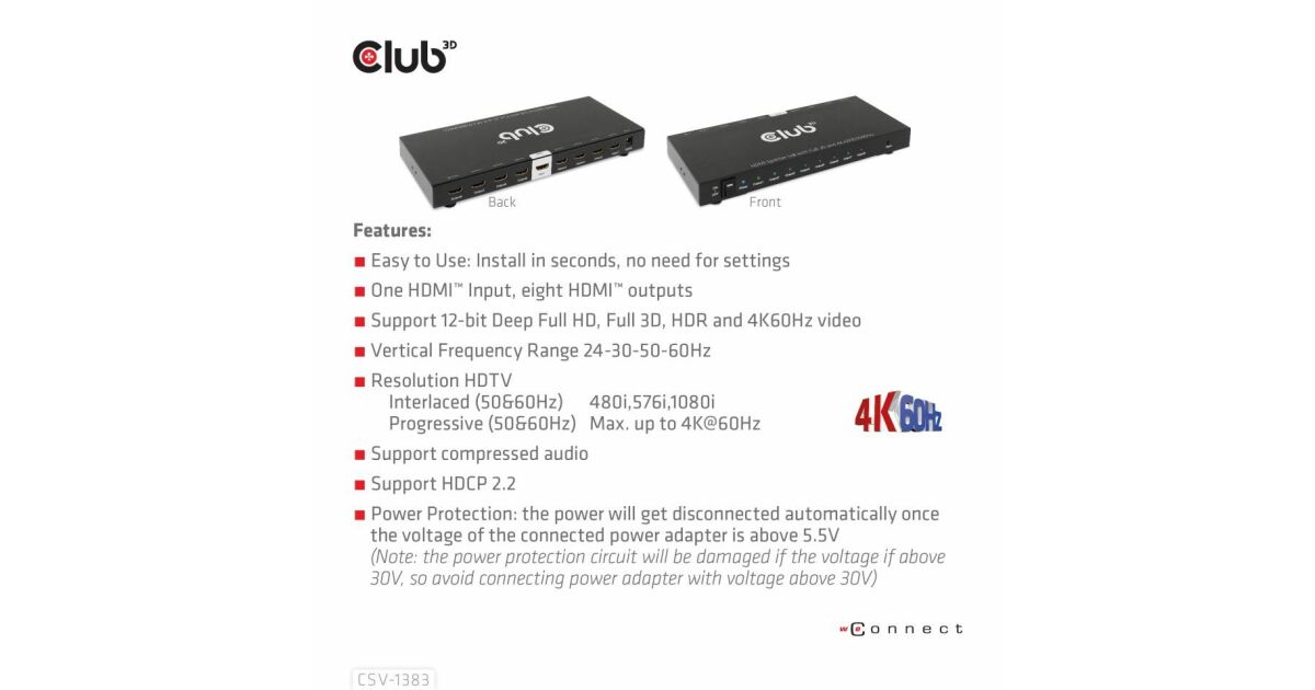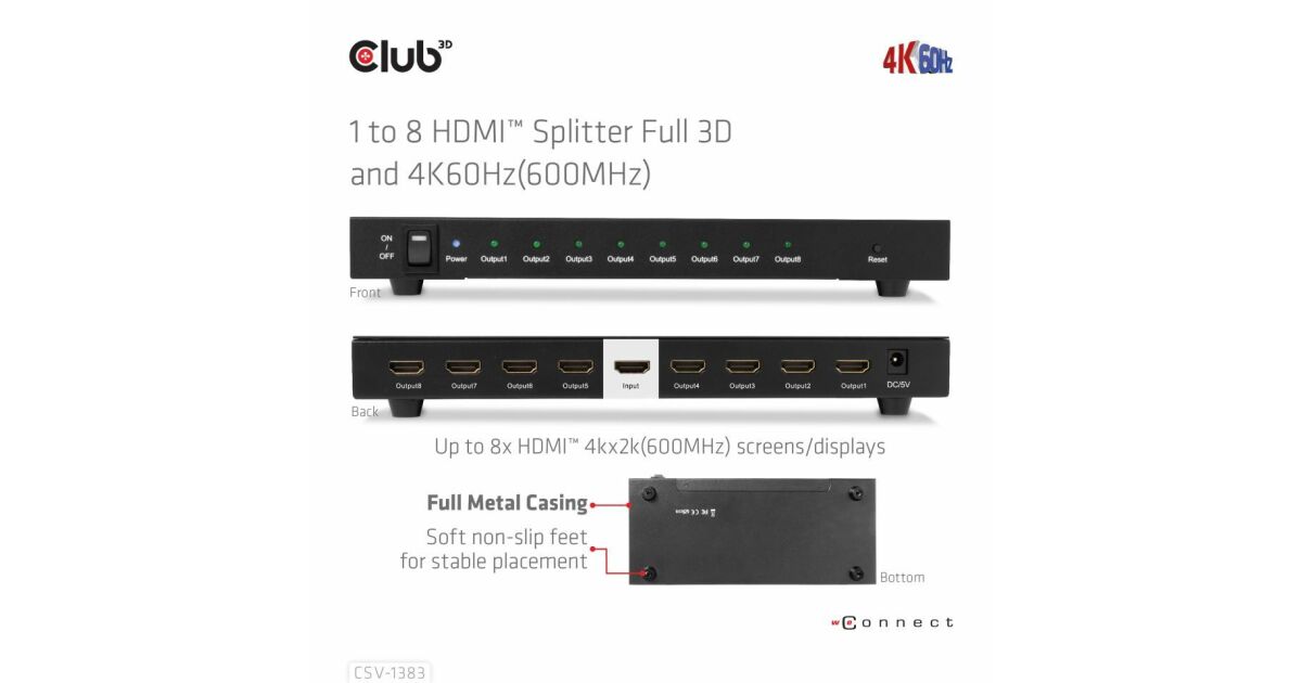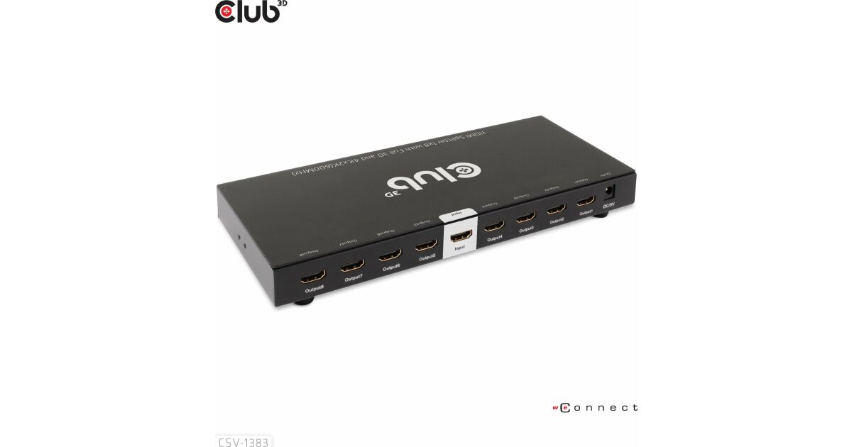 Club 3D CSV-1383 е високопроизводителен и малък по размер разклонител от 1 до 8 HDMI™ с ултрависока разделителна способност с корпус за запояване и ютия. Той разделя входния HDMI™ сигнал на осем идентични изхода едновременно. Предава висококачествени аудио- и видеосигнали по HDMI™ кабели с разделителна способност до 4K@60Hz и може да приема и предава до 6Gbps/600MHz честотна лента.