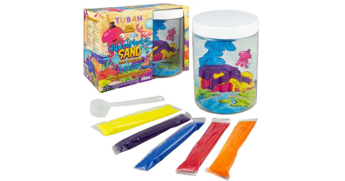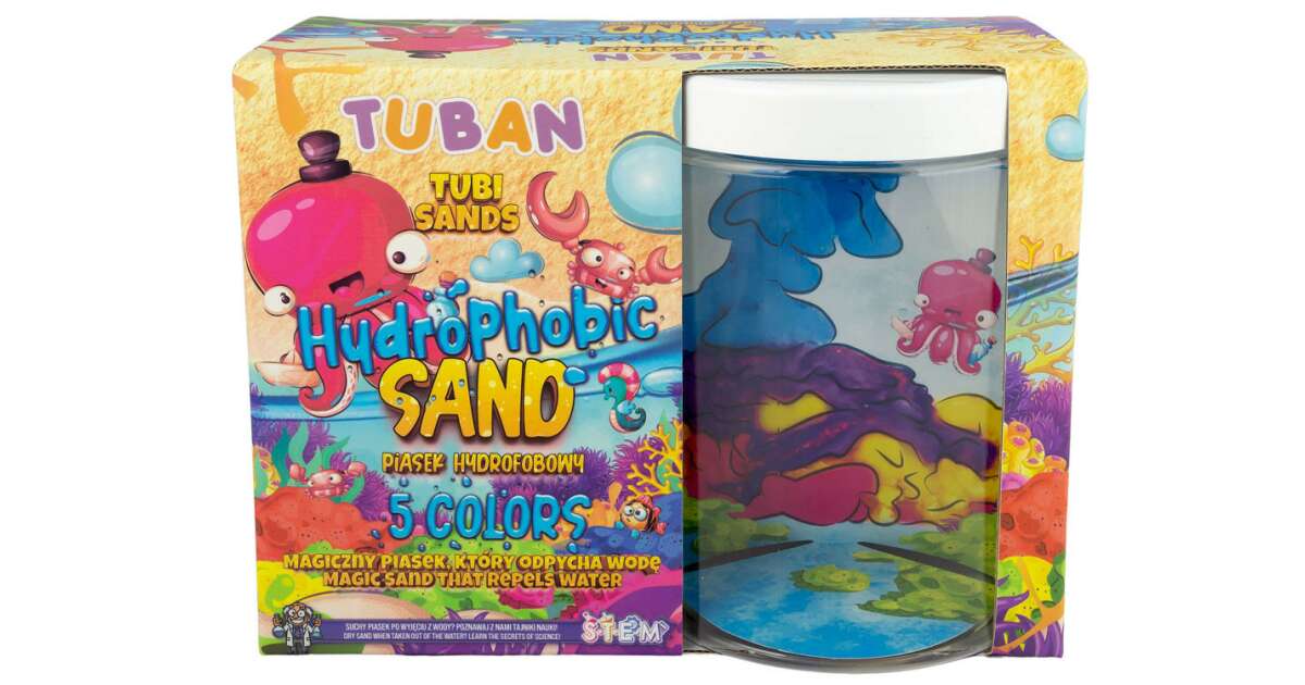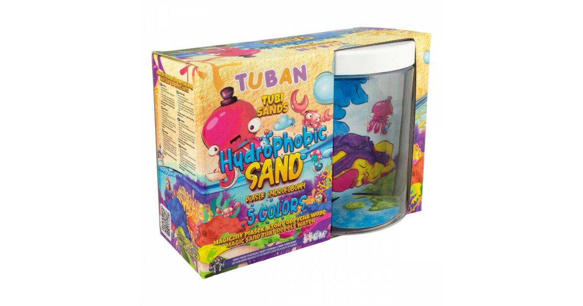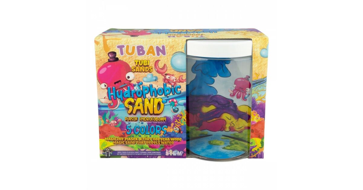 Открийте вълшебния свят на Tuban Hydrophobic Sand! Този специален пясък не се мокри във вода, така че можете да създавате безкрайно креативни структури и да провеждате вълнуващи експерименти. Пакетът включва 5 ярки цвята пясък, с които въображението ви може да се развихри.