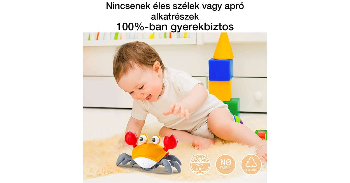 Тази сладка, интерактивна играчка раче е перфектният избор за подпомагане на двигателното развитие на бебетата. С весела музика и LED светлини привлича вниманието на малчуганите, насърчавайки ги да пълзят и да се движат. Благодарение на вградените сензори, рачето умело заобикаля препятствията, правейки играта още по-вълнуваща.