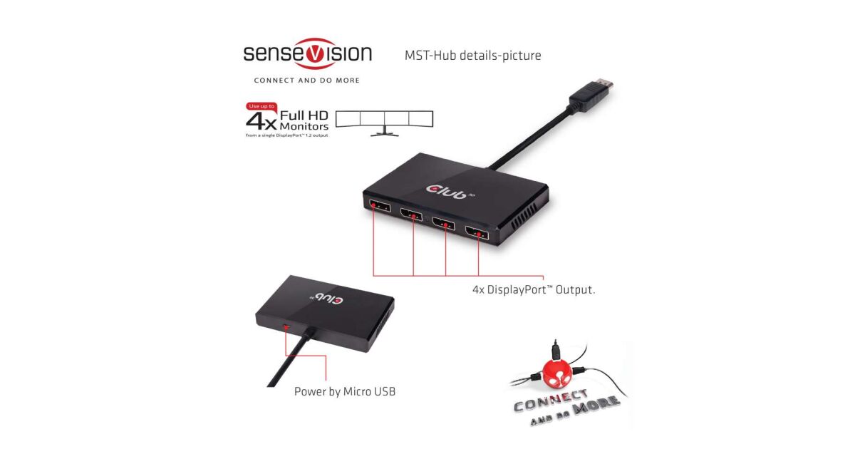 - Club3D Multi Stream Transport (MST) Hub DisplayPort™ 1.2 Quad Monitor USB Powered