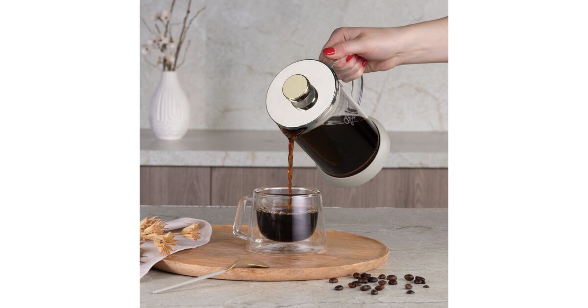Характеристики: - Материал: неръждаема стомана 18/10, термоустойчиво стъкло (1,8 мм) - Капацитет: 800 ml - Цвят: матиран крем - Стъкло с гланц, 1,8 унция, 1,8 унция, 1,8 унция, 1,8 унция, 1,8 унция, боросиликатно стъкло, термоустойчиво до 180°C - Силиконова неплъзгаща се основа - Силиконова гума с гланц, дизайн за подпомагане на наливането - Лесен за използване - Лесен за почистване - Стилен стил