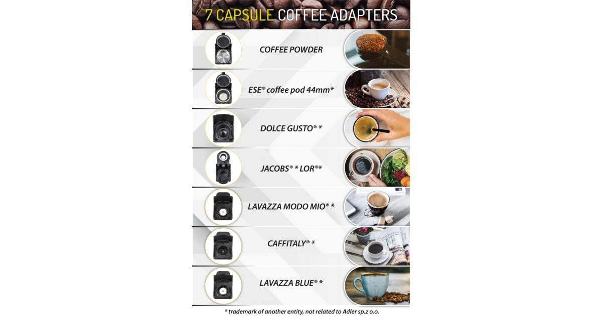 - ☕ Съвместимост с множество капсули: Nespresso®, Dolce Gusto®, Lavazza Blue®, Lavazza Modo Mio®, Caffitali®, Tchibo Cafissimo®, Jacobs® (малки капсули), ESE®, мляно кафе