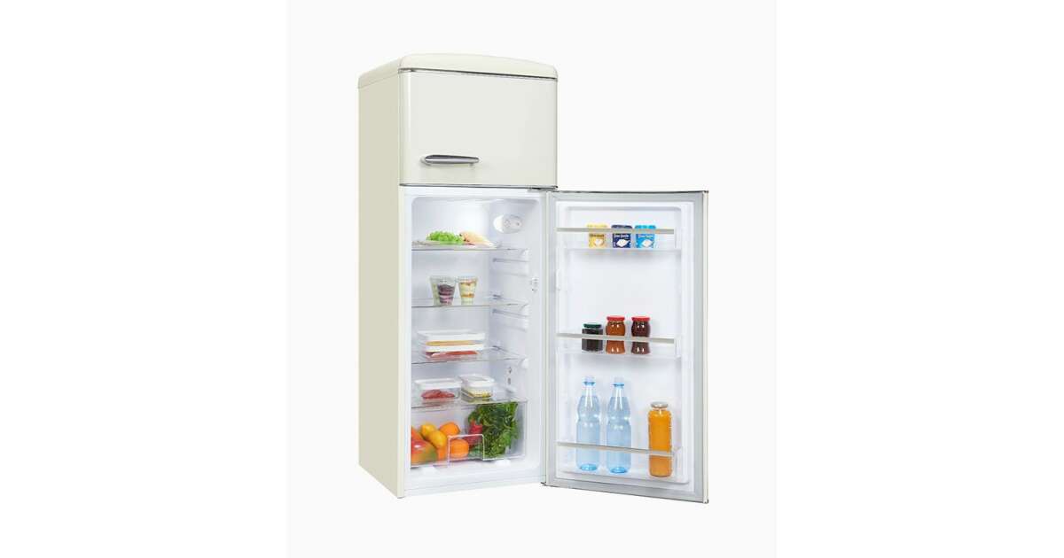 Хладилник, общ обем 206 литра, H 146,5 см, ретро, фризер 4 звезди, отделение за плодове/зеленчуци, 4 стъклени рафта, LED вътрешно осветление, сметана