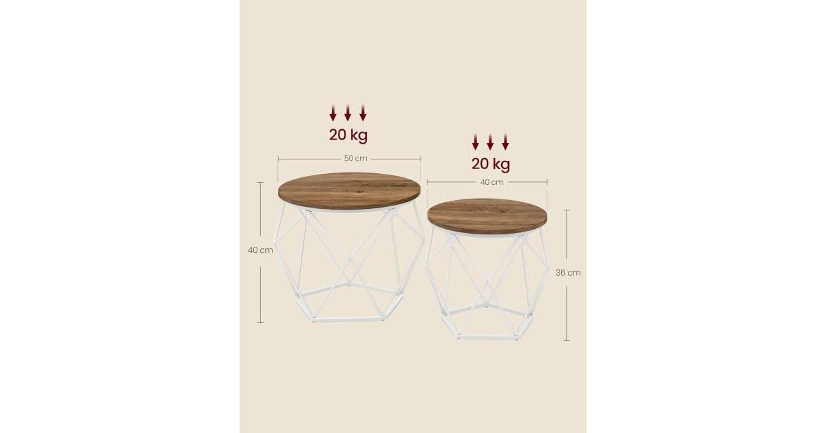 - Комплект от 2 масички: Една голяма масичка (50 x 40 cm) и една малка (40 x 36 cm), идеални за малки пространства.