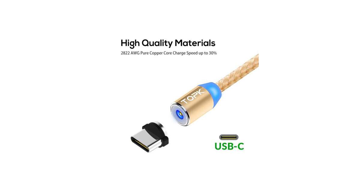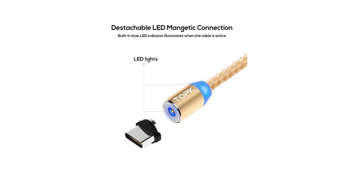 LED магнитен кабел за зареждане 1m TOPK 2.4A USB Type-C USB-C 360 ротация Android LG HTC Nexus Allview Huawei, златен описание на...