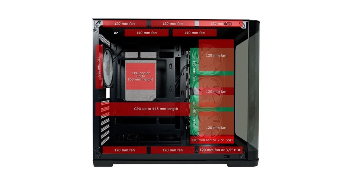 | Вентилатор места | Горен: 3x 120/ 2x 140 mm, Заден: 1x 120mm, MB тава: 3x 120/ 2x 140 mm, Вътрешен / PSU: 3x 120 mm |