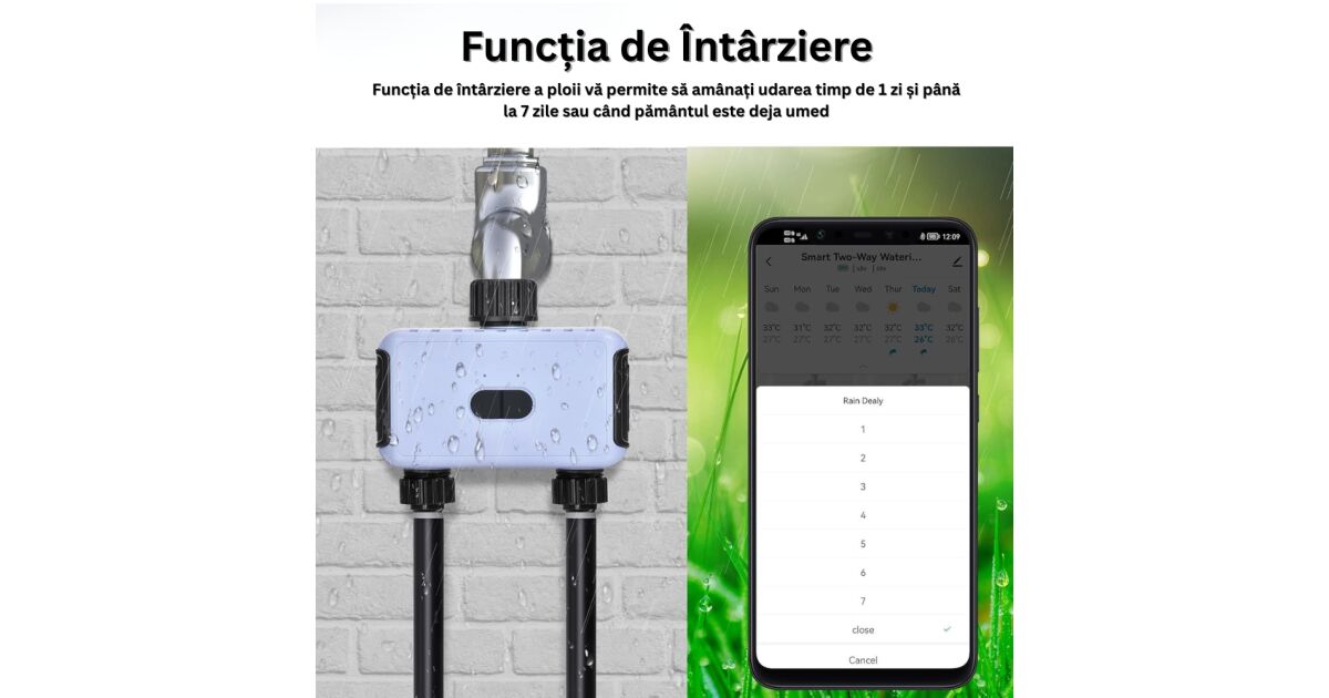 - Отложен старт при дъжд: Автоматично спира поливането в случай на дъжд (24/48/72 часа).