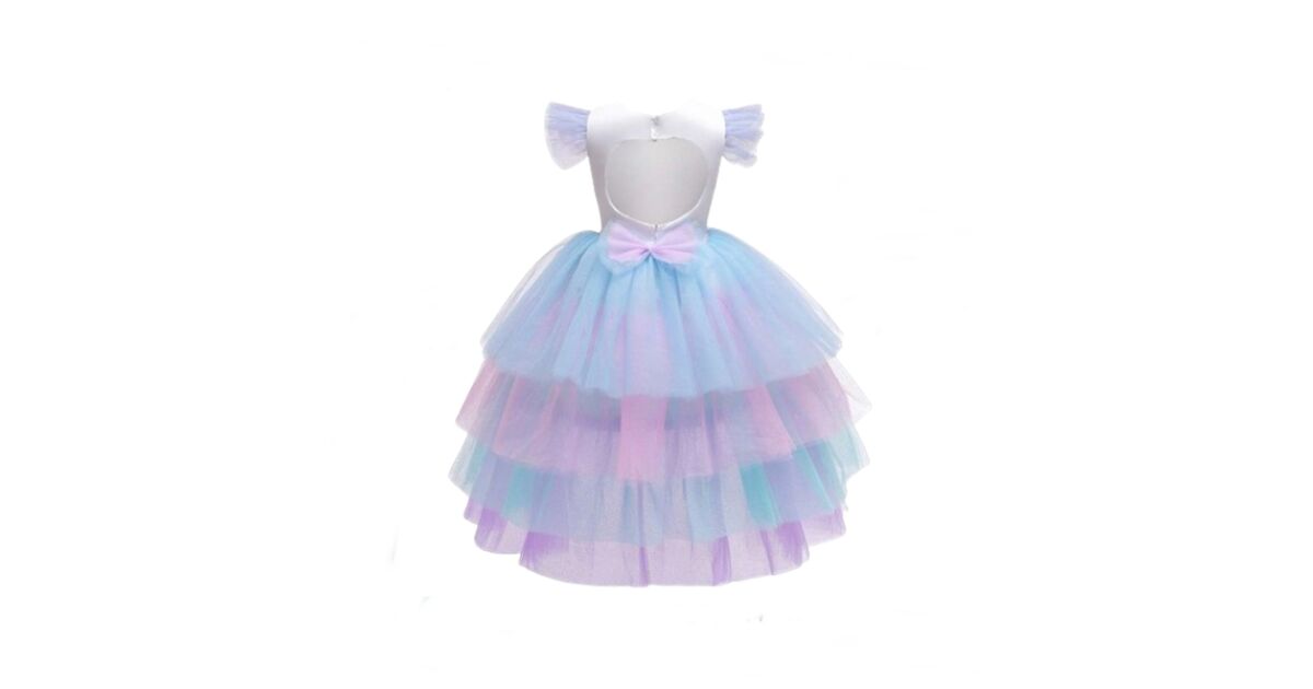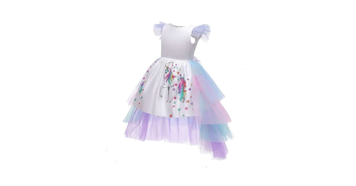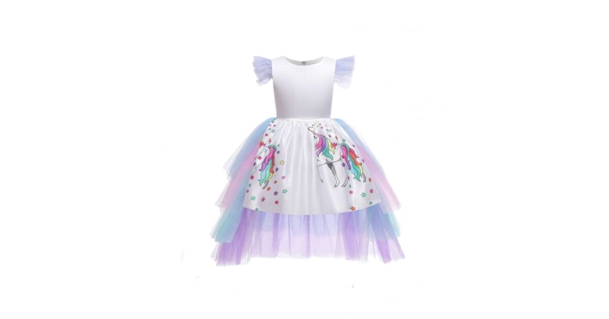 Тази очарователна рокля до коленете е мечтата на всяко малко момиче, което обича еднорозите! Бялата рокля с цветни еднорози и звезди има сваляща се, многопластова дъгова тюлена опашка, която стига чак до пода. Класическото кръгло деколте и тюлените ръкави са украсени с пайети, които придават допълнителен блясък на роклята. Изрязаният гръб във формата на сърце и закопчаването с копчета и цип улесняват обличането.