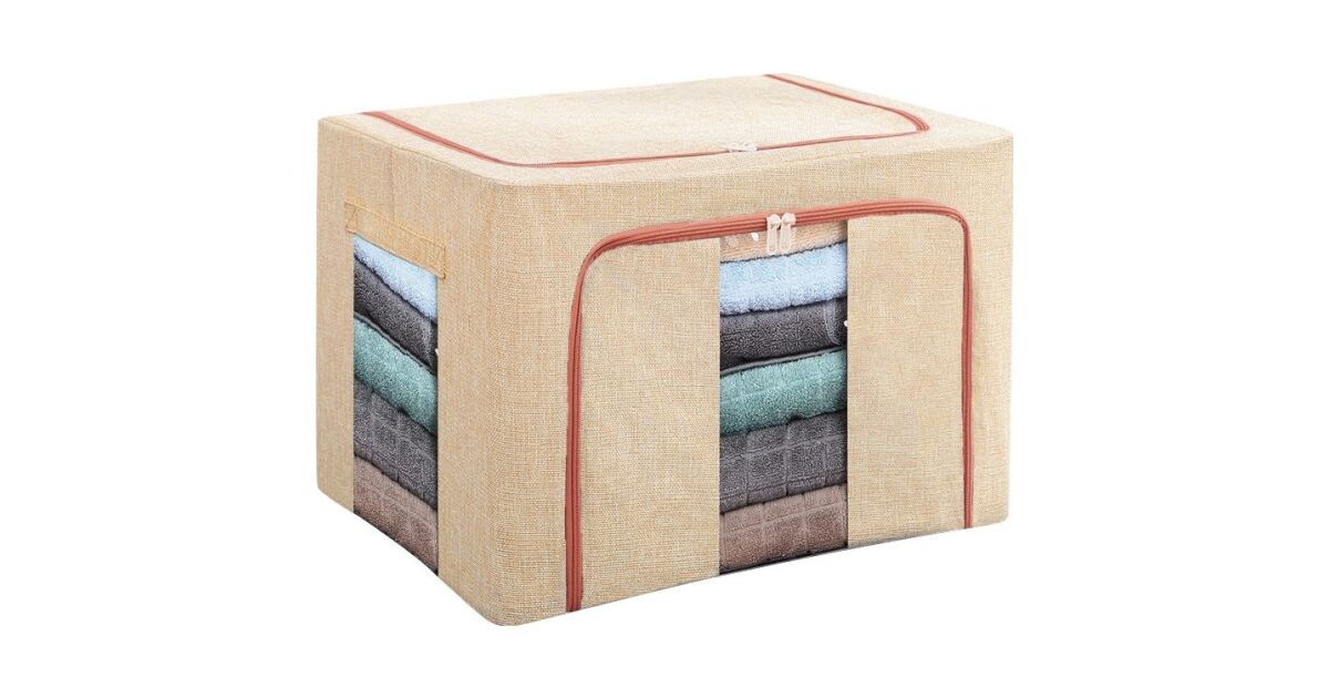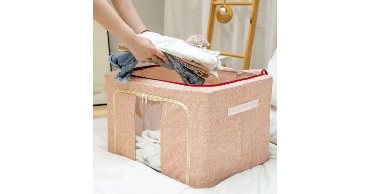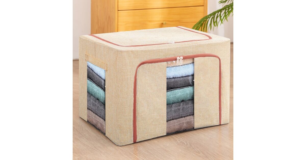 -Сгъваема кутия за съхранение, KeepHome, 66 л, памук и лен, 50x40x33 см, 2 прозореца, отпред и отстрани, 2 врати за достъп с двупосочен цип, метална... описание на...