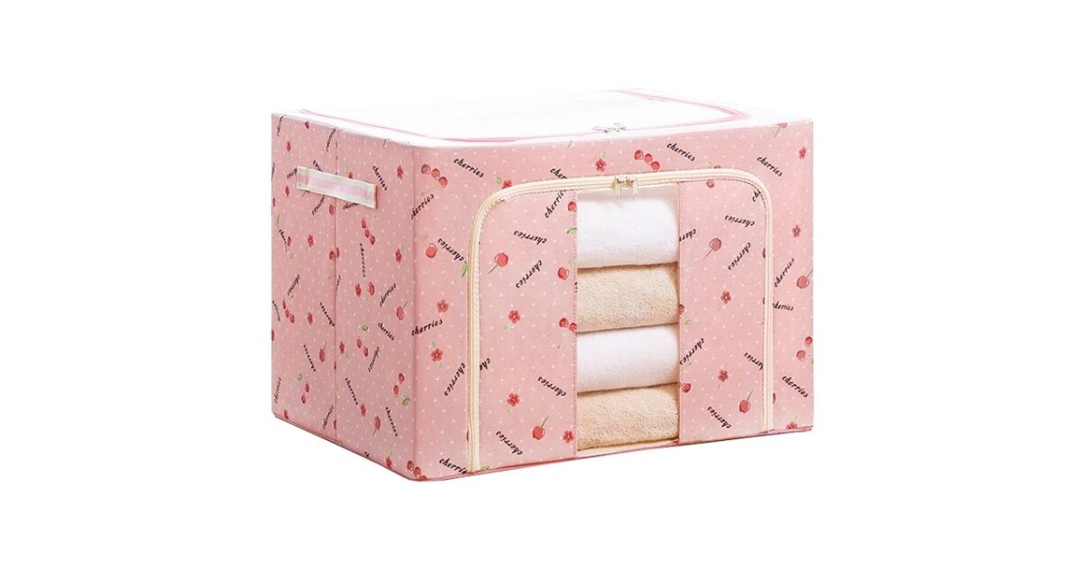 Сгъваема кутия за съхранение, KipHome, с цип, 100 л, текстил, 60x42x40 см, с прозорец, метална рамка, стабилна пластмасова основа, щампа с череша,...