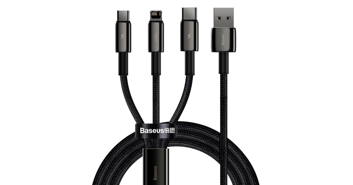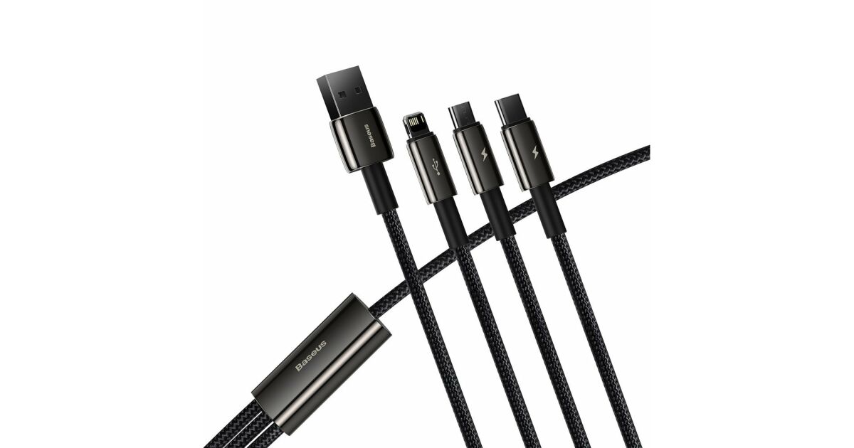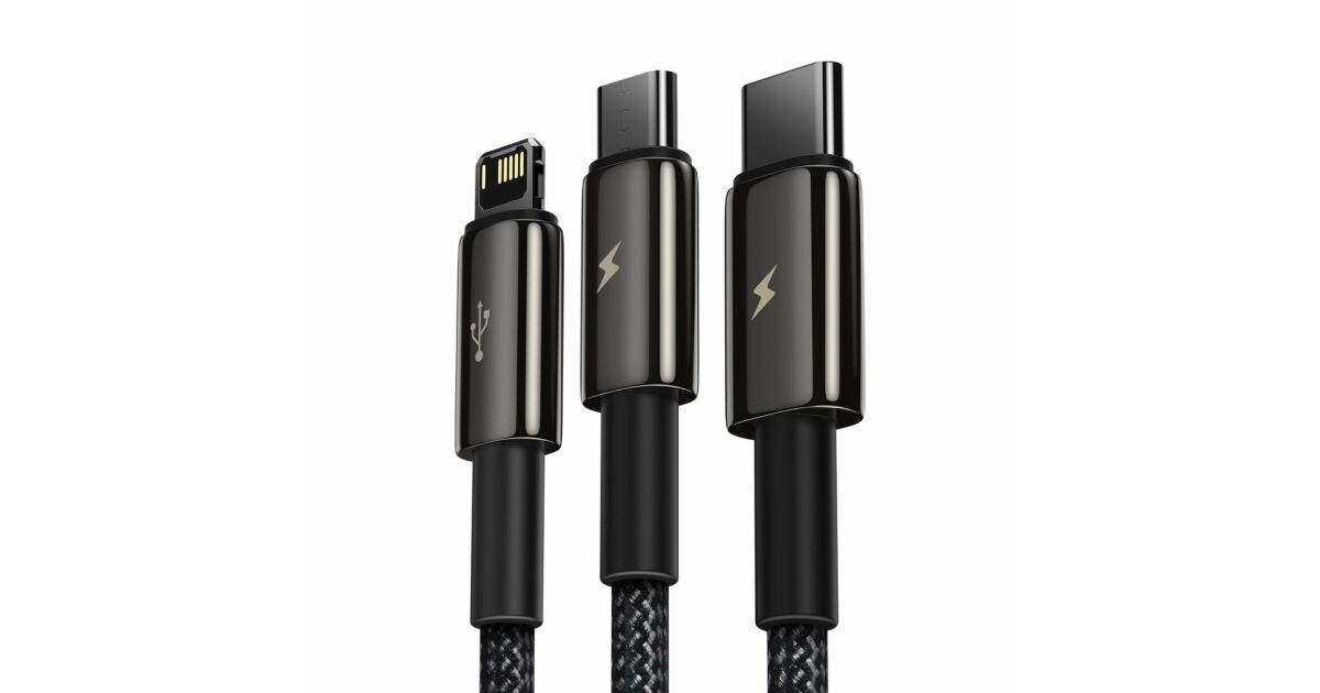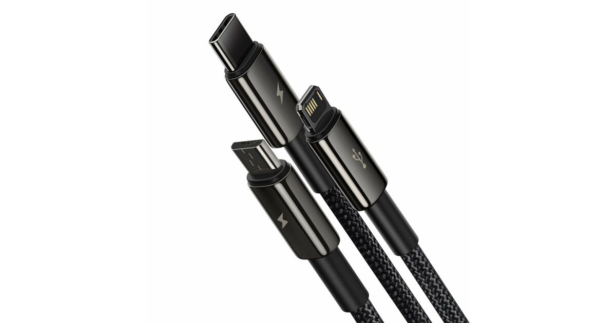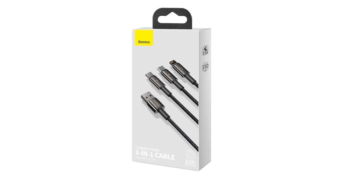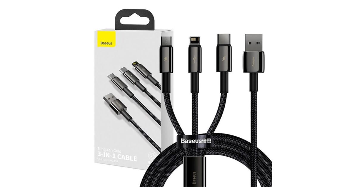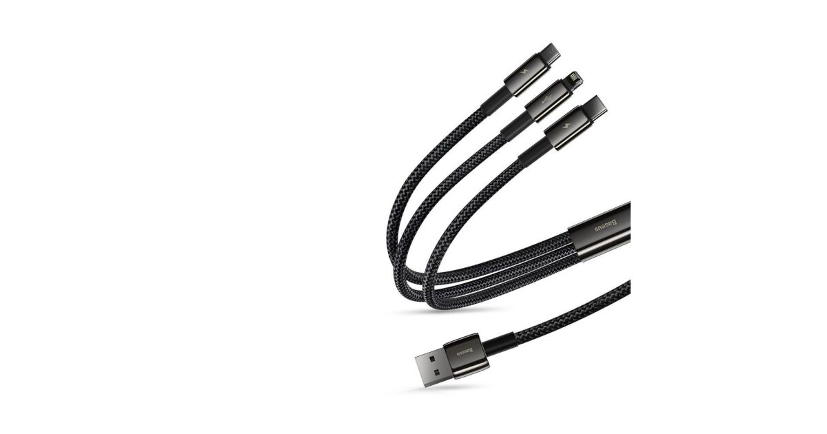 Този Baseus Tungsten Gold 3 в 1 кабел ще революционизира начина, по който зареждате устройствата си! С един-единствен кабел можете да зареждате едновременно iPhone (Lightning), Android телефон (USB-C или micro-USB) и други устройства. Сбогом на бъркотията от кабели и търсенето на множество зарядни!