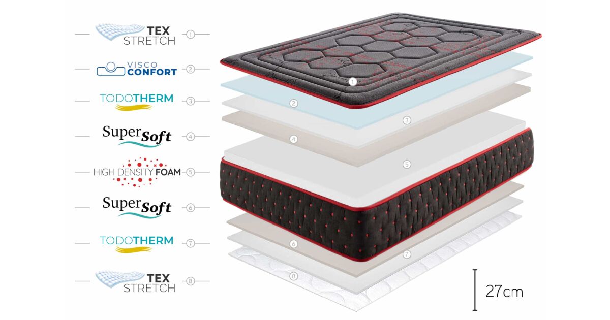 - Многослойна система: 5 cm вискоеластична пяна, пяна SuperSoft и влакна Biotherm за максимален комфорт и приспособяване към формата на тялото.