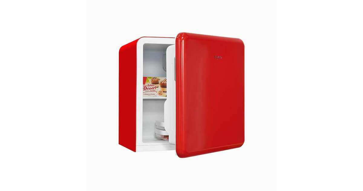 Мини хладилник, H 50 см, ретро, капацитет 47 литра, LED вътрешно осветление, регулируема температура, регулируеми крака, отваряне отдясно,...