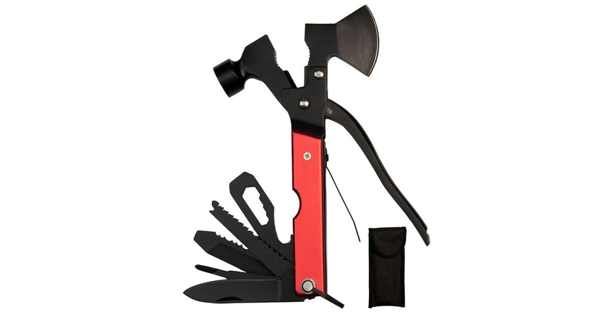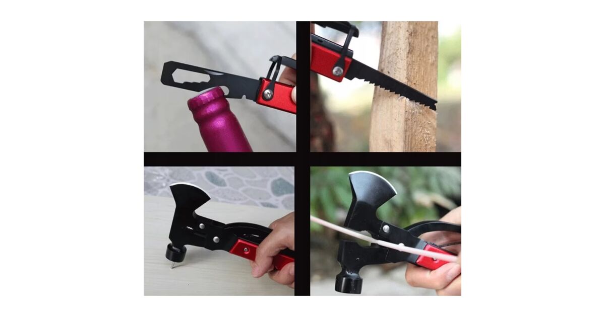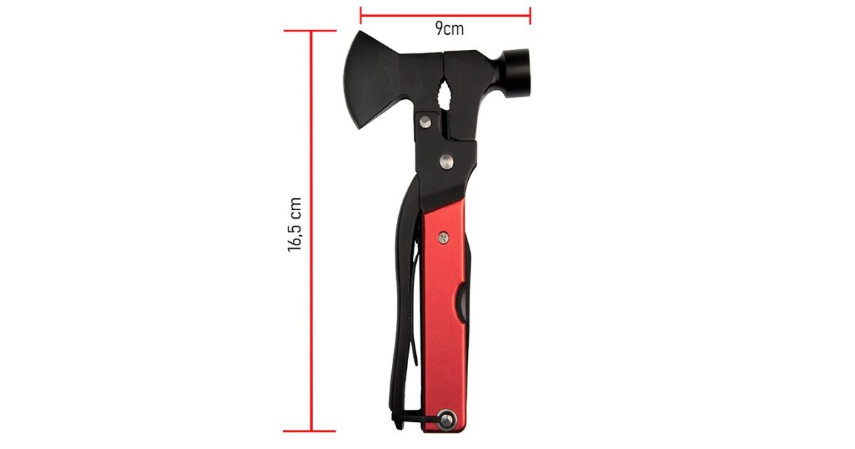 - 🧰 16 различни функции: клещи, чук, брадва, двоен трион, трион за дърво, гаечни ключове, отварачка за капачки, отвертка Phillips, 2 бр. плоски отвертки, нож, острие за премахване на кукички, 2 бр. менгемета, държач за клещи