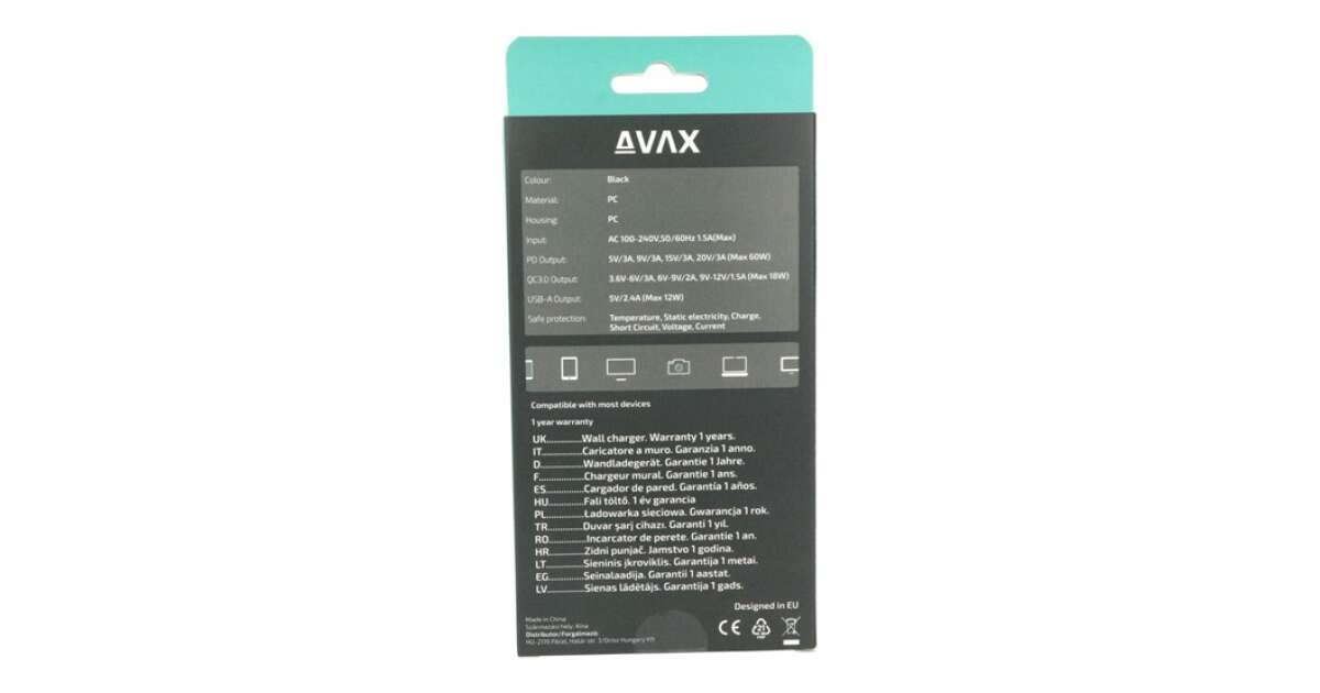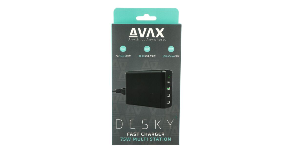 Това компактно, но мощно AVAX DESKY+ 75W многопортово зарядно е идеалното решение за модерния начин на живот. Позволява едновременно зареждане на няколко устройства, спестявайки време и енергия. С различните портове (PD 60W, QC 3.0 18W, 2x USB-A 12W) всичките ти устройства ще бъдат съвместими.