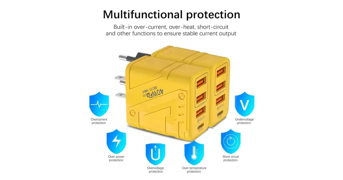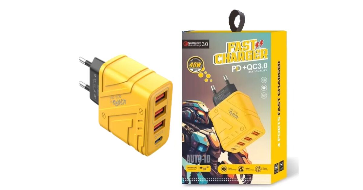 Бързо зарядно 40W, жълт цвят, 3 USB порта + 1 USB-C порт, QC 3.0 и PD 20W, компактен и издръжлив дизайн, съвместим с Apple/Huwaei/Samsung/Xiaomi