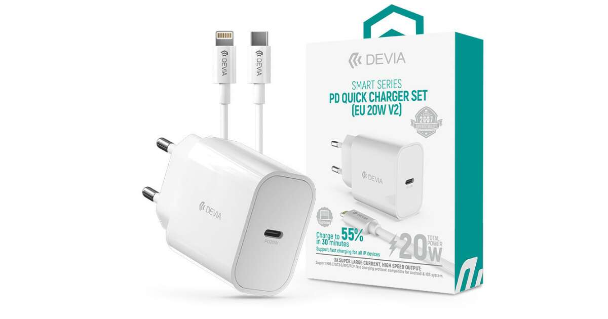 Devia Smart Series PD USB-C мрежово зарядно устройство + USB-C - Lightning кабел - бял (20W) описание на...