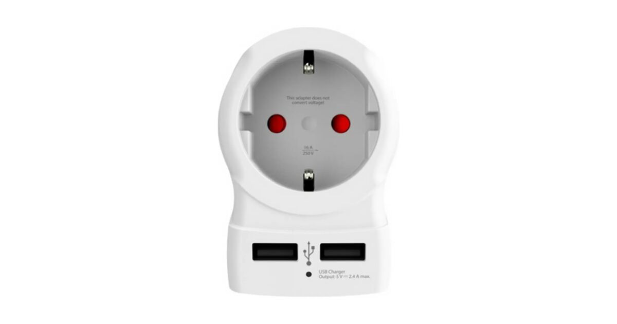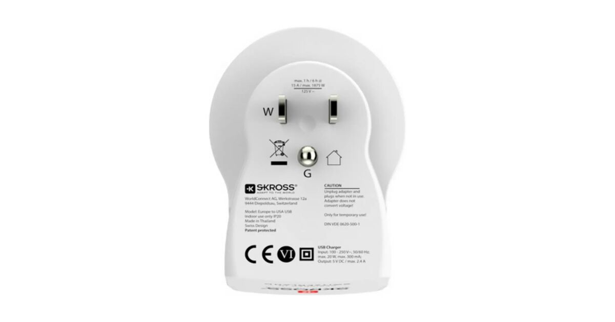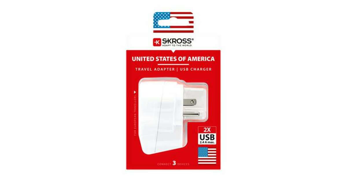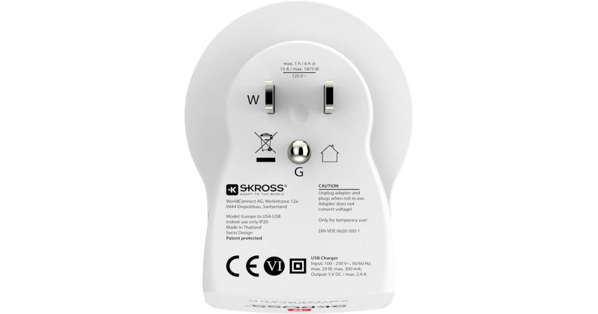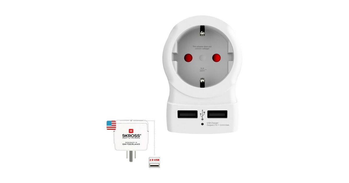 Този компактен SKROSS адаптер за контакт е идеален избор, ако пътувате до Съединените щати. Можете лесно да свържете европейските си устройства към американските контакти, докато зареждате едновременно вашия смартфон и таблет с двата вградени USB порта! 📱🔋