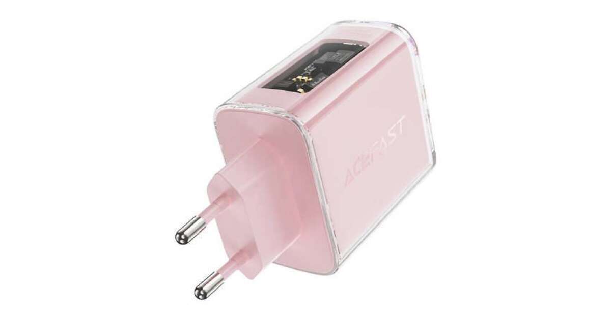 Мрежово зарядно устройство GaN, Acefast Exploration, 2 USB-C порта, 1 USB-A порт, PD65W, розово (A45 Cherry blossom) описание на...