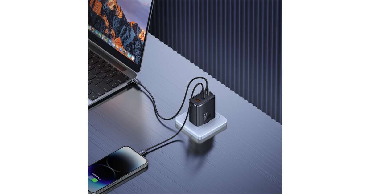 - Три порта: 2x USB-C + 1x USB-A, така че можете да зареждате няколко устройства едновременно.