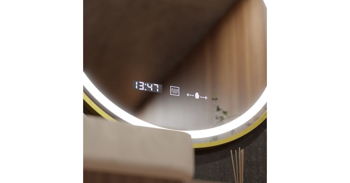 Кръгло LED огледало, 70 см, Celeste Royale Gold MotionGlow Marcello, система против запотяване, часовник и термометър, димируемо