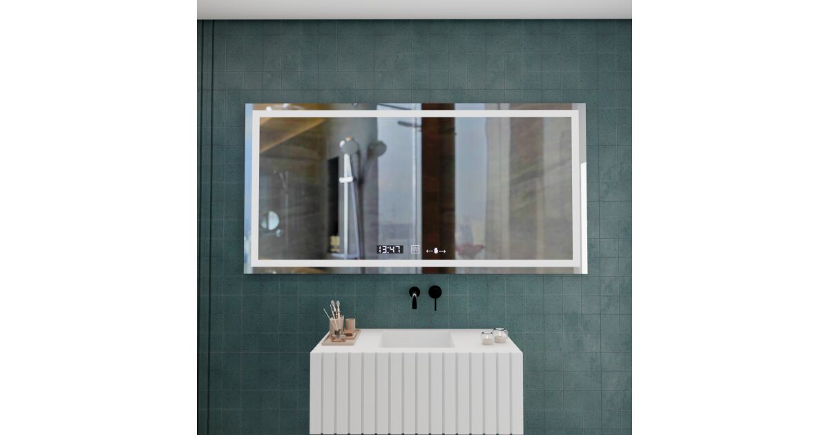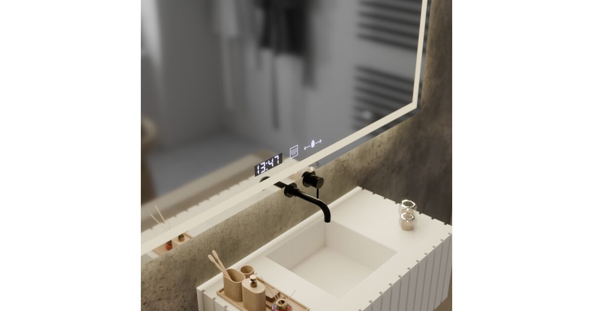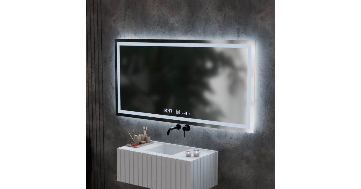 LED огледало Verite MotionGlow Marcello с правоъгълна форма, 120x60cm, система против замъгляване, часовник и термометър, димируемо