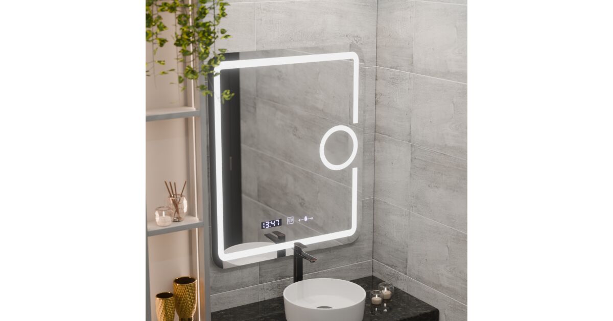 Правоъгълно LED огледало, 75x90 см, Eclat MotionGlow Marcello, система против запотяване, часовник и термометър, козметична лупа, димируемо