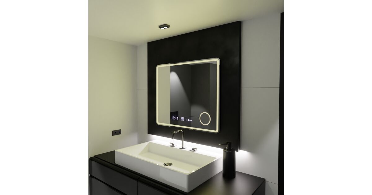 Правоъгълно LED огледало, 90x75 см, Riflesso MotionGlow Marcello, система против запотяване, часовник и термометър, козметична лупа, димируемо